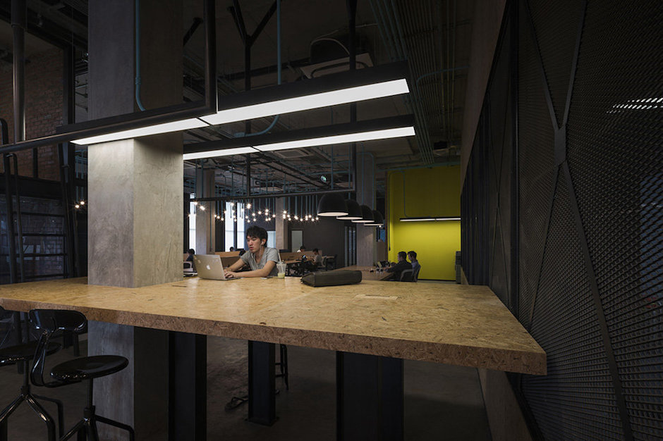 Hubba是泰國最早的聯合辦公平臺之一,由Amarit與Charle Charoenphan兄弟在2012年創立,旨在為初創公司和獨立經營者提供共享的社區工作環境。如今他們想要創建一個同之前完全不一樣的新模式,于是Hubba與泰國最大的地產開發商Sansiri合作,在Sansiri所建造的住宅區的中心商場,打造了一處專供藝術家聯合辦公的社區Hubba-to。為了適應新的社區,Hubba提出將工作系統中的“制造”這一環節放大,以此為理念打造一個 “匠人空間”。該空間包括一些手工作坊如陶器、木工工作室、開放式烹飪廚房和攝影技術暗房等。Hubba-to還增加了用于講座和演示的放映室,以及用于研討會的講習班。這樣的目的意在廣泛宣傳他們的物聯網科技,以及聯合辦公的共享哲學。