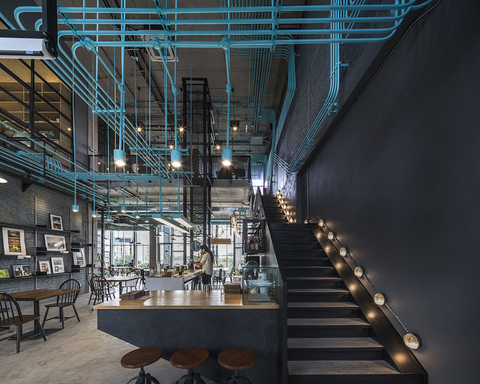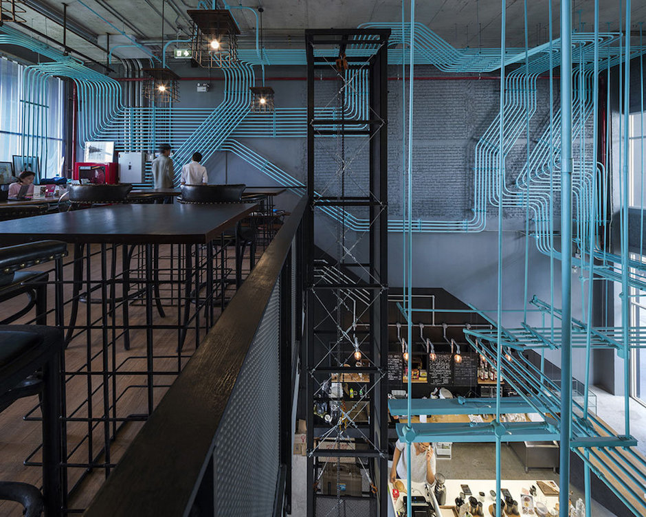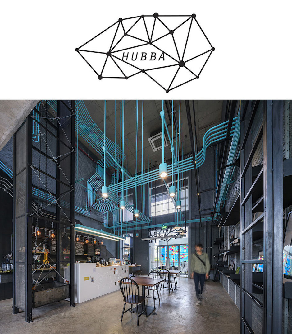 Hubba-to的創意靈感源自于Hubba的網絡狀標志圖形,設計強化并延續這種網絡線條,將其演化為有趣的空間元素,蔓延穿梭于一至二樓從而形成統一的視覺空間。這樣的構想之所以能實現,是因為現實施工中確實存在許多的機電設備管線。Supermachine設計團隊只要善加利用這些管線、并刻意強化增加管線系統、然后有目的的設計組織管線安裝路徑。縱橫交錯的管線一律噴成漂亮的綠松石色彩,流暢的藍綠色管道在墻面、天花、空間中婉轉穿梭,營造出令人震撼的視覺效果,為沉重的工業風帶來靈動和創新。