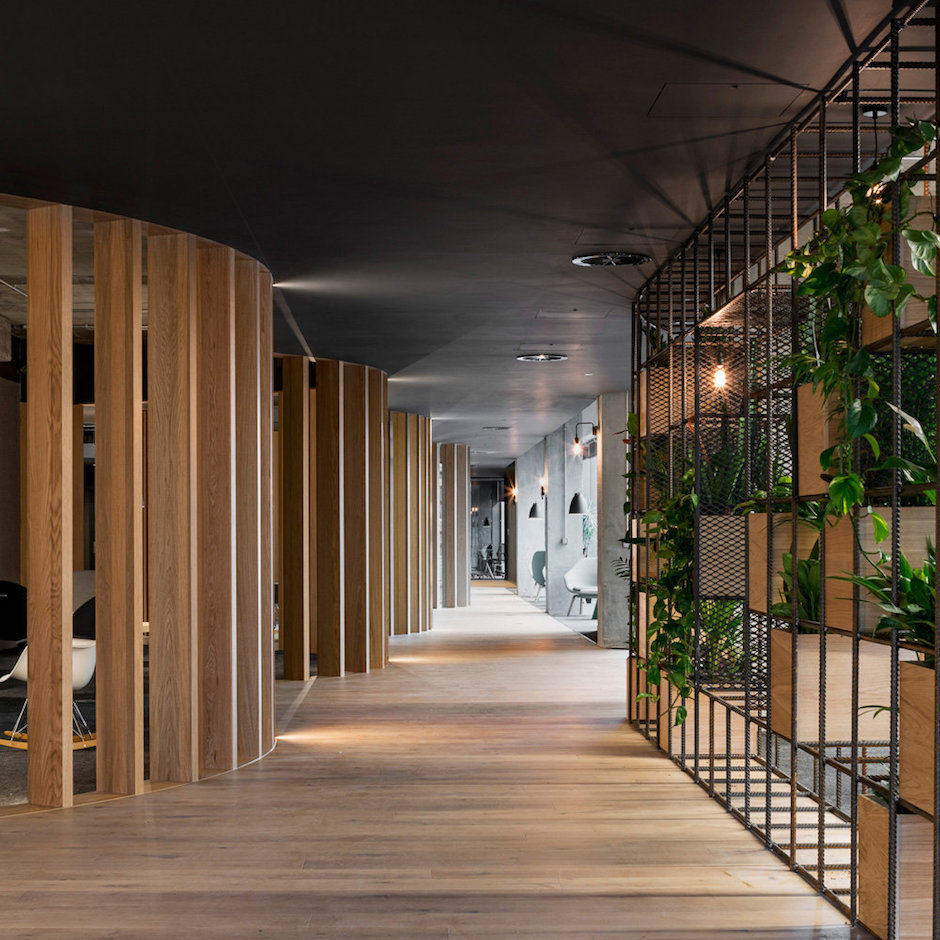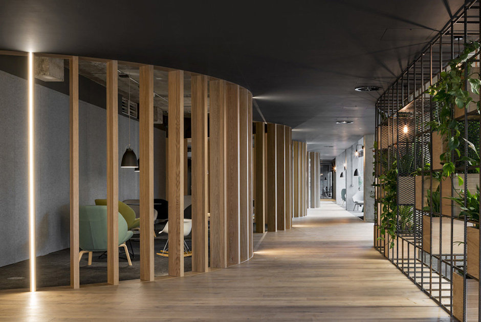 Tags:科技公司,沉穩暗色調、橡木與灰色、曲線、城市道路肌理、“街道”主動線、中央集會空間、橡木隔斷、螺紋鋼筋裝飾架、工業風