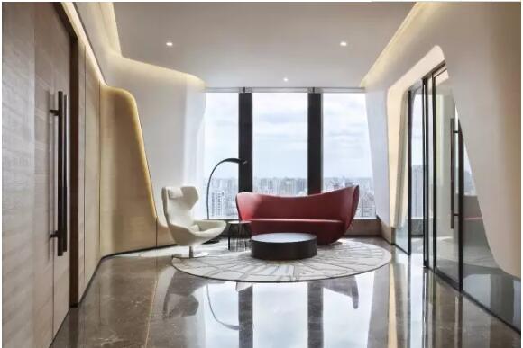 董事房的隔墻由不同切面的木材拼湊而成,玄關位置摒棄一般以盆栽作裝飾,換上線條簡約高低不一的燈飾,形成細緻而素雅的景觀。房間內一整面落地玻璃引入城景,居高臨下感受繁盛的大都市,以沉穩的灰色作基調,軟裝同樣以現代的線條配合,同時滲入暖色調增添溫度與活力。