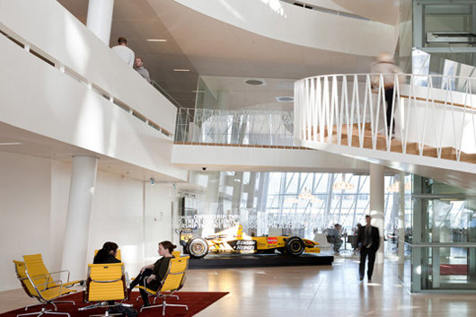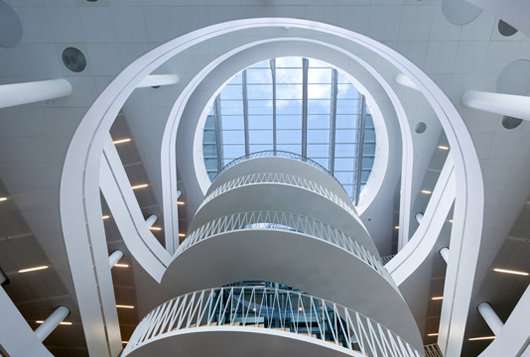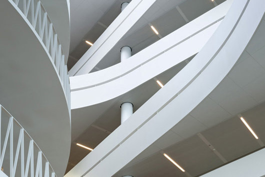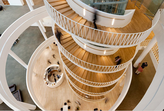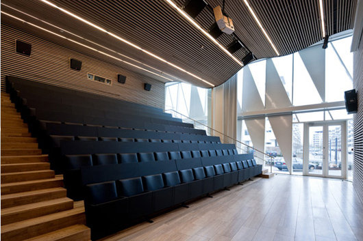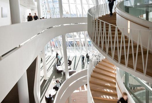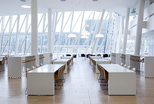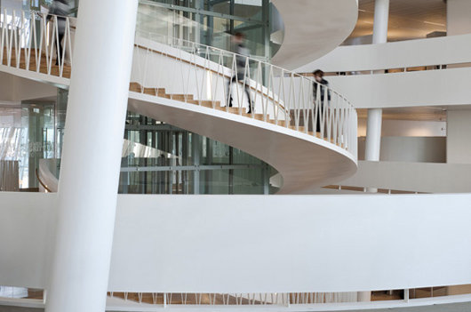 在2004年的國(guó)際設(shè)計(jì)競(jìng)賽上,丹麥投資銀行Saxo將一等獎(jiǎng)授予了3XN事務(wù)所。這家以通訊信息為基礎(chǔ)的銀行需要為其35個(gè)國(guó)籍的850名員工建造一座總部,反映其動(dòng)態(tài)、開(kāi)放、學(xué)習(xí)和展望未來(lái)的態(tài)度。因此,銀行總部更像是一座“學(xué)習(xí)環(huán)境”,要求設(shè)置分享知識(shí)的社交空間,并且足夠?qū)挻蟆?/p>